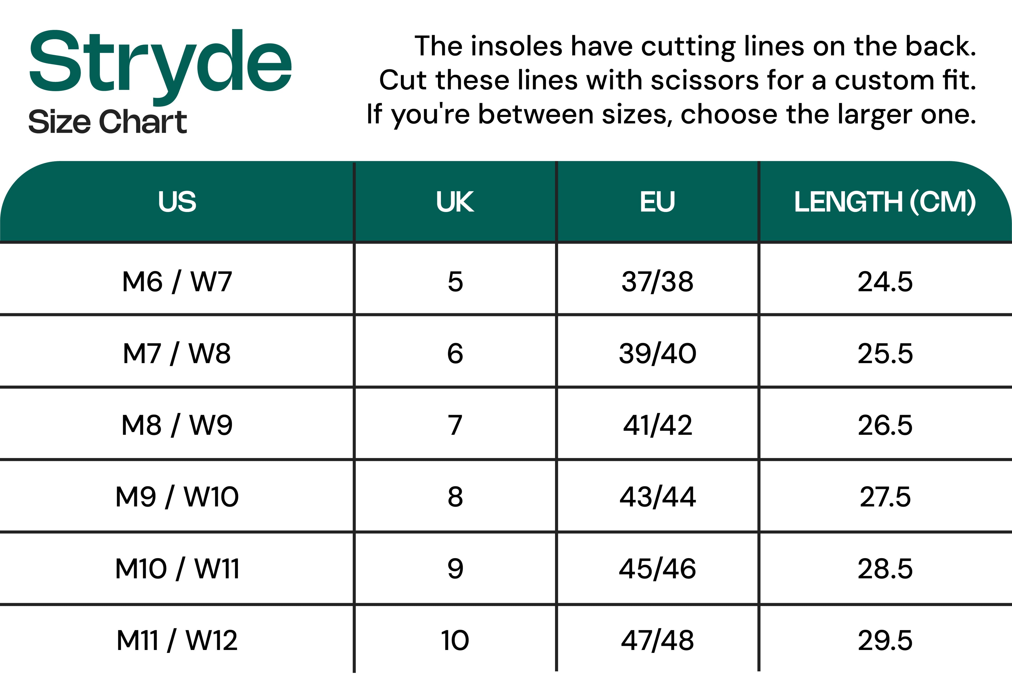 Always size up! Our insoles can be cut to fit your perfect shoe size.